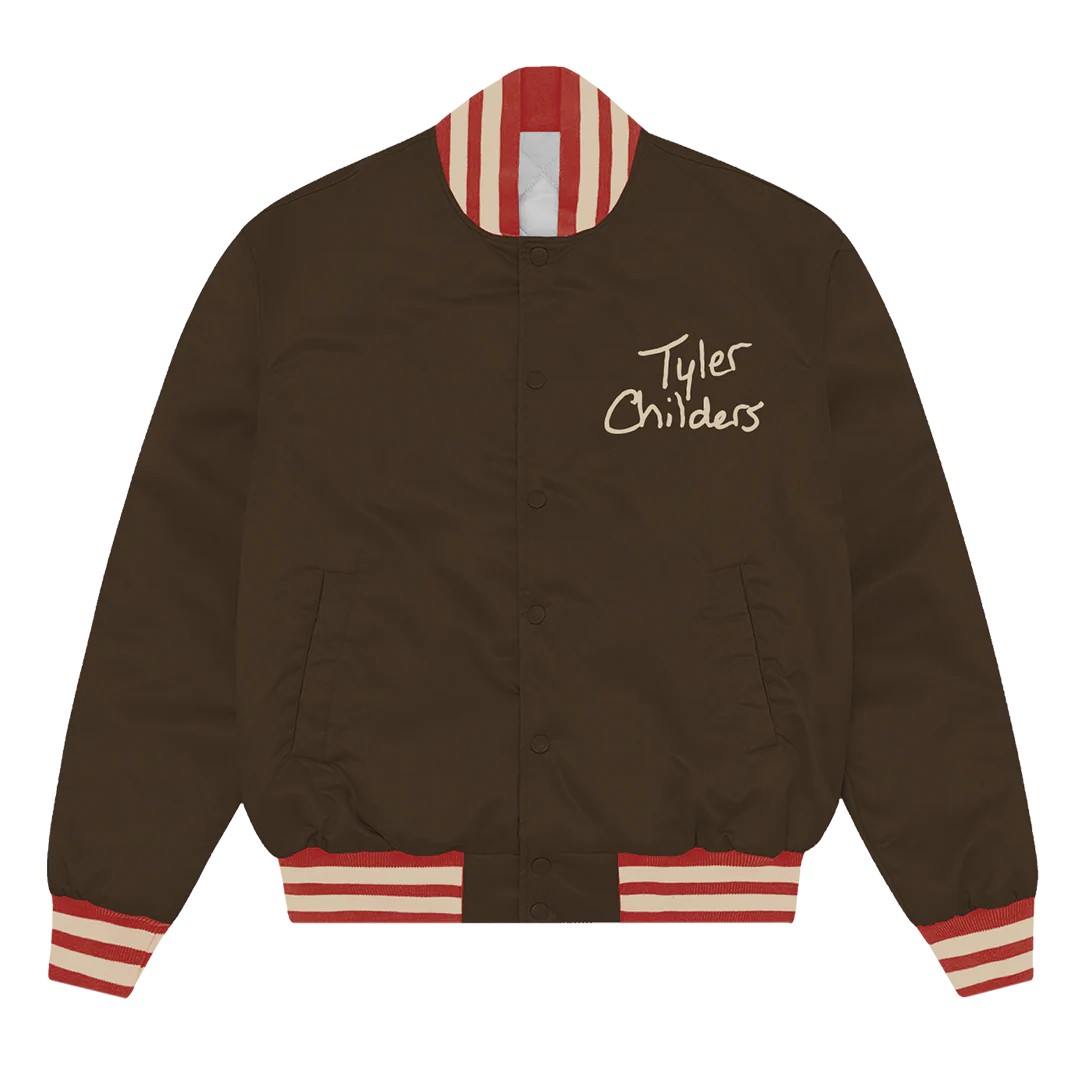 Official Tyler Childers Merchandise. Brown, 100% polyester custom bomber jacket featuring the Tyler Childers logo embroidered on the front left chest and an embroidered silhouette of Hilary on the back.